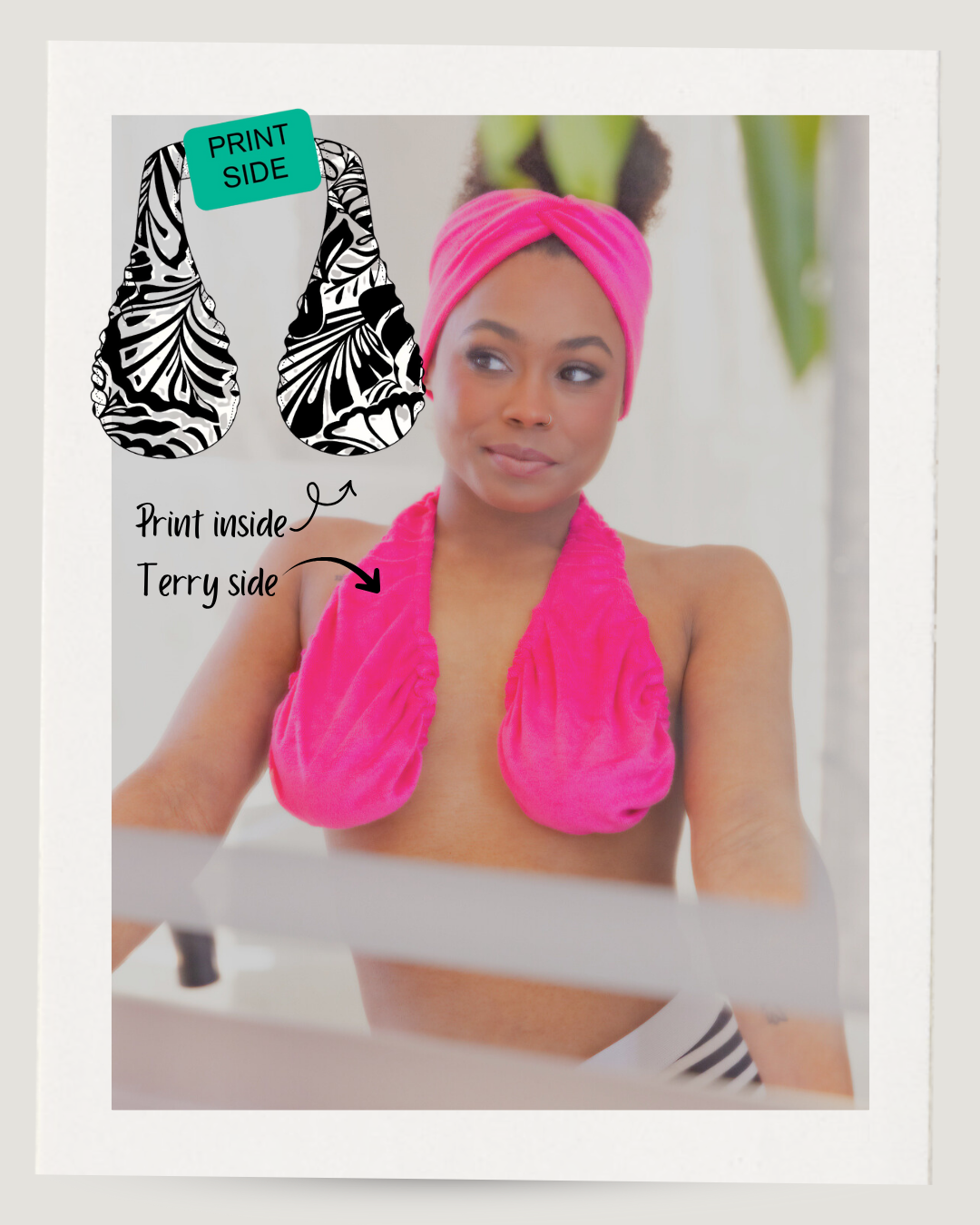 WARNING: Ta-Ta Towels are a halter-style lounge bra that goes around the back of your neck. If you have any neck issues or discomfort when wearing halter-style type apparel then we suggest purchasing the ToobTop instead.